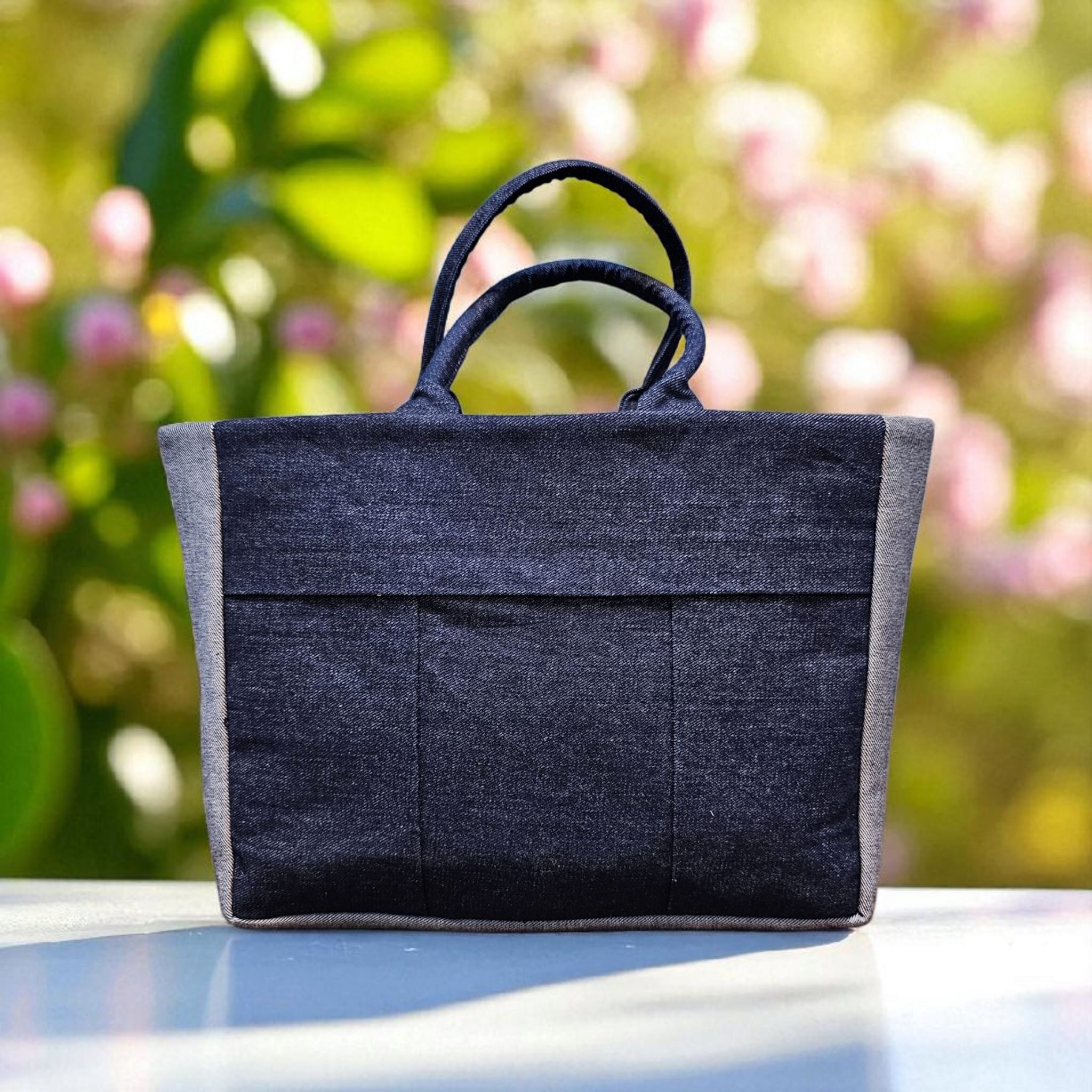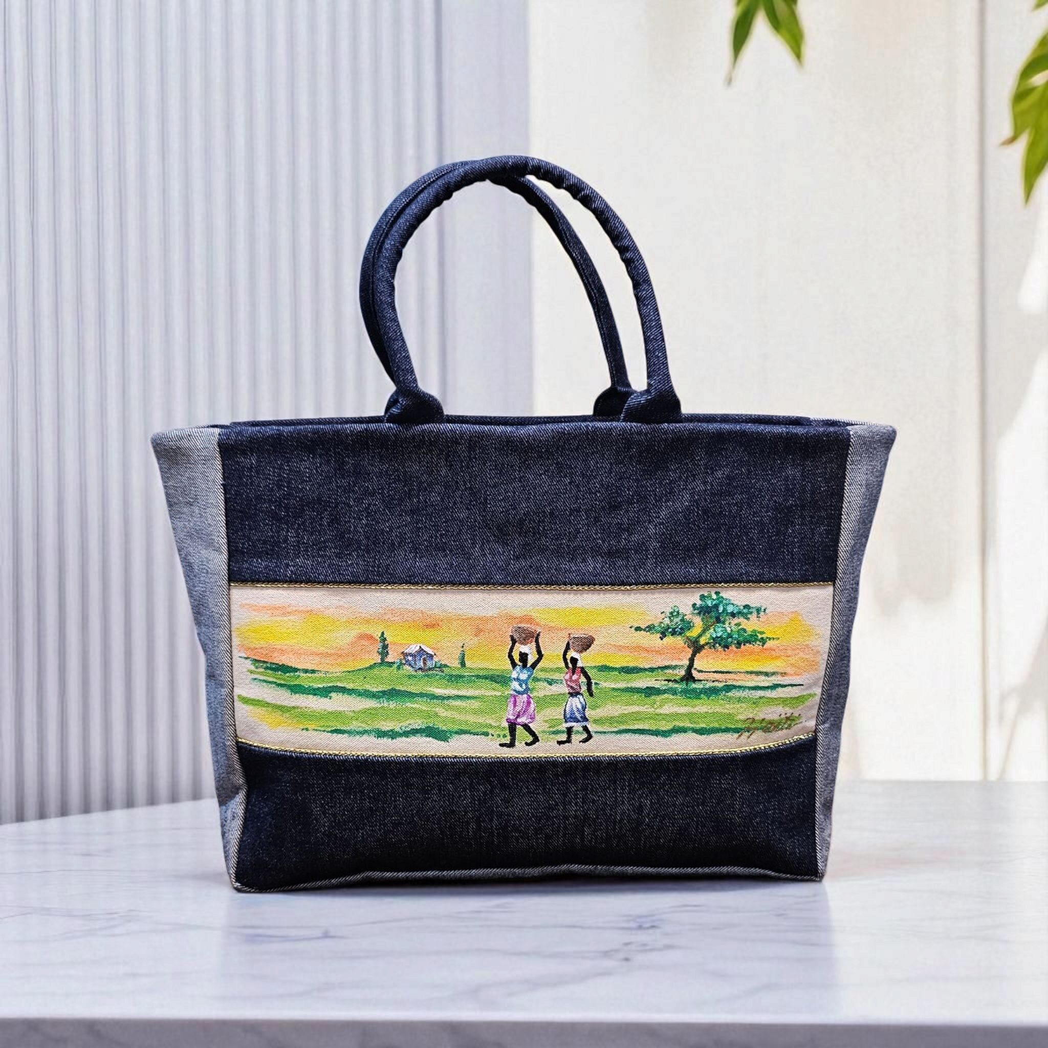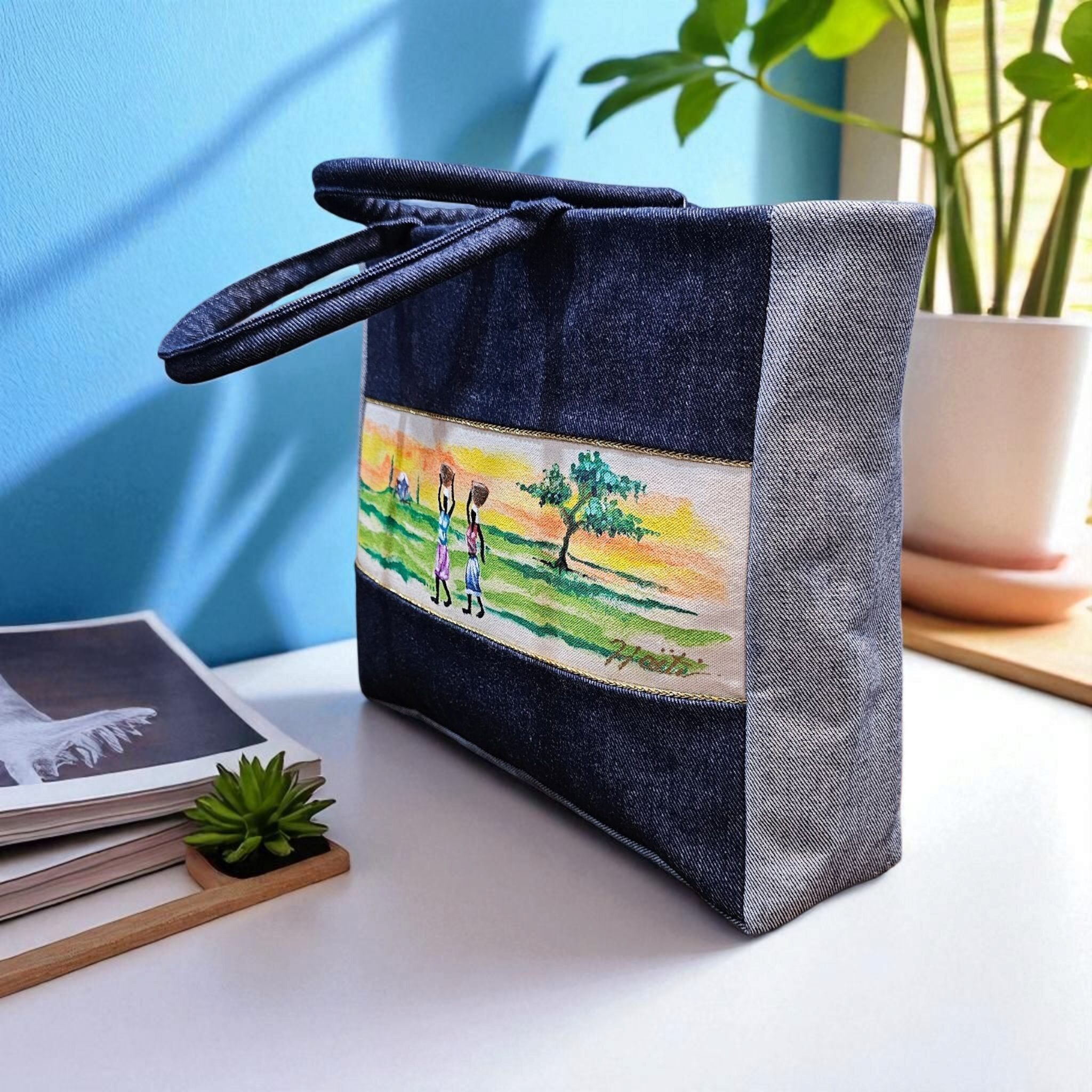 Introducing an ultra-firm denim tote handbag with a fabric lining adorned with intricate hand-painted designs, drawing inspiration from the designer’s rich cultural heritage and diversity. This unique piece is meticulously crafted with a satin interior lining and features a zipper top closure for secure storage. Complete with a satin-lined pocket, it offers ample space for laptop, documents, accessories, business cards, phone, cables, charger and makeup bag. Its elegant design and ideal sizing make it perfect for work, travel and weekend bag. Handmade by women artisans in Haiti, this stunning piece is a stylish addition to any wardrobe.